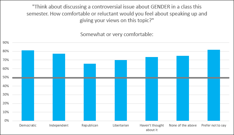 First, when asked about their comfort speaking in class, 85% of all U.S. college students responded that they would be somewhat or very comfortable discussing a “noncontroversial” topic in class. This varied slightly by political party, which may be interesting. But basically, about 75-85% of students indicated they were comfortable talking at all in class, across political affiliations.