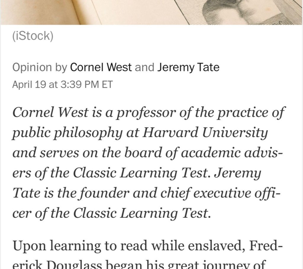 The West-Tate essay, however, also seems to be a kind of viral marketing for the Classic Learning Test. Cornel West is on the CLT’s board of academic advisors, while Jeremy Tate is the CEO of its for-profit parent company, Classic Learning Initiatives, LLC.