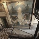 However, we do spend some time with one work of art. Francis Schaeffer begins this episode on location in Lausanne, Switzerland, inside the Palais de Justice de Montbenon, the sometime seat of Switzerland’s supreme court. Here we see a huge mural painted at the beginning of the 20th century. It depicts justice as a woman clothed in white and gold, holding scales and a sword, pointing at an open book labeled “the law of God.”