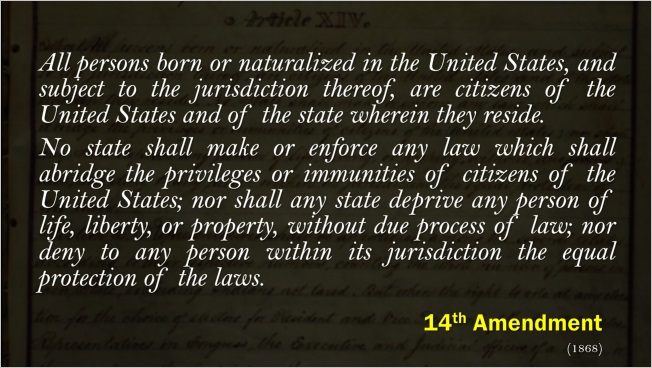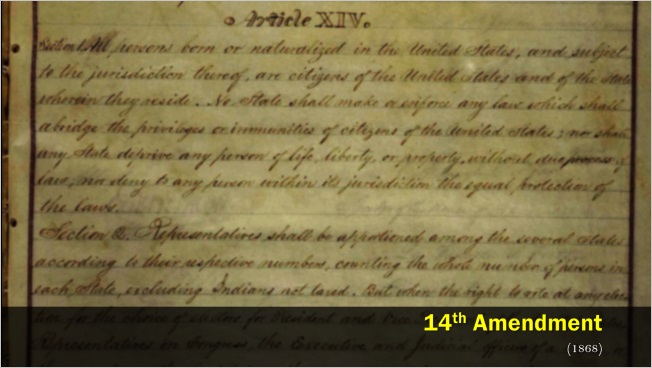 Then, picking up my laser pointer, I drew attention to several clauses and concepts that would become the basis for major shifts in American law, in future decades if not during Reconstruction itself: birthright citizenship, the privileges and immunities clause, the due process clause, and the equal protection clause.