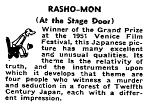 A few weeks later, though, Dean A. Myers of the Columbus Dispatch offered moviegoers in Ohio a somewhat different interpretation. He described the film in a March 19 review as showing “what a slippery thing truth is when men, in seeking to grasp it, twist it to their own view of things until each man has his own little standard of right and wrong—but not the truth.” For Myers, Rashōmon was about sordid lies and self-delusion, not diverse perspectives or imperfections of memory.