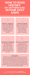 Jacqueline Antonovich introduced me to a really helpful infographic made by another history professor, Blair Stein, adapting original text by Mar Hicks. It shows a four-step process for retaining information from your history reading assignments. With Stein’s permission, I’m sharing this graphic here as something you may want to download and share. (Click on the image to open a full-sized version.)