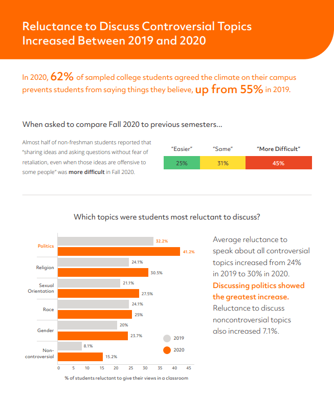 This week, Heterodox Academy—an organization founded in 2015 to promote “open inquiry, viewpoint diversity, and constructive disagreement” in universities—released the results of a survey conducted in the fall of 2020 on U.S. college campuses.